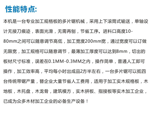整機優勢:適合任何種類木材加工。鋸片裝卸方便,進料口出料口雙重防反彈裝置設計,確保操作安全。達到不燒鋸片,加工穩定順暢的效果。